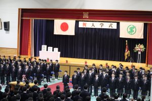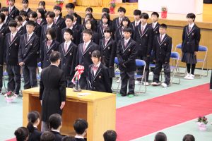 学校長式辞より~中学校で学ぶ上で、大切にしてほしい3つの心のお話がありました。まずは、「創造する心」です。自分の考えや意見をしっかりと持ち、新しい自分を創りあげてください。そのためにも全ての土台となる基礎・基本を大切にしていきましょう。 2つ目に、「挑戦する心」です。仲間たちと意見を出し合いながら、お互いに伸びていこうとする姿勢を持ちましょう。チャンスは自ら創り出すものです。3つ目に「感動する心」です。喜びや悔しさは、だれもが味わいます。しかし、喜びや悔しさも次の意欲につなげてこそ、大きく成長するものです。中学校生活でこの三つの心を大切にすることが、自分の中にある可能性を伸ばしていきます。皆さんは、それぞれが無限の可能性を持っています。中学校は、皆さんの可能性を伸ばす場所です。自分を磨き、輝かせる場所です。夢を見つけ、それを実現するための力をつける場所です。互いに励まし合い、磨き合いながら新たな時代を担っていく、心豊かでたくましい若者に成長してください。