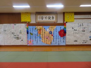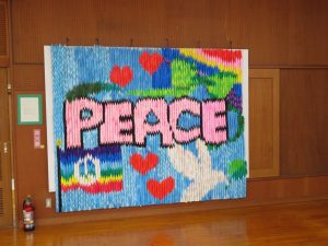 「PEACE」という文字を鶴の折り紙で仕上げていました。2年生のみんなが一生懸命鶴を折って作って出来上がったすばらしいものでした。