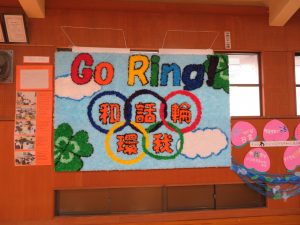 学年目標ではお花紙を発砲スチロールに刺していったものでした。根気のいる作業だったと思います。劇にちなんだ桃ノ木をイメージした作品は桃のカード一つ一つにメッセージが書かれていました。