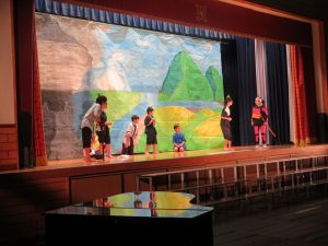 戦争を題材に平和を訴える演劇でした。演技はもちろんバックの絵やセット等とても工夫されていたと思います。