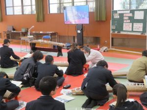 1月14日(水)、15日(木)の2日間、1年生の音楽の授業において上山梢葉先生を講師としたお招きし、筝曲に取り組みました。みんな戸惑いながらも頑張って挑戦し、「さくらさくら」のきれいな音色が聞こえていました。