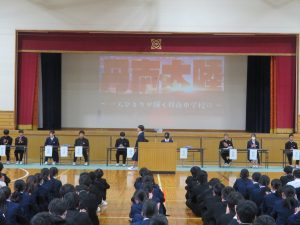 4月26日(金)6校時、第1回生徒総会を行いました。今年度の生徒会スローガンは「丹南大陸」~一人ひとりが輝く丹南中学校に~です。